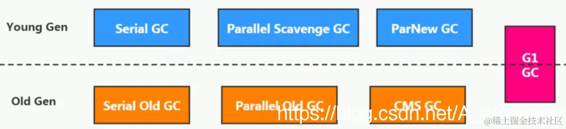 4.按工作的内存区间分,又可分为年轻代垃圾回收器和老年代垃圾回收器。