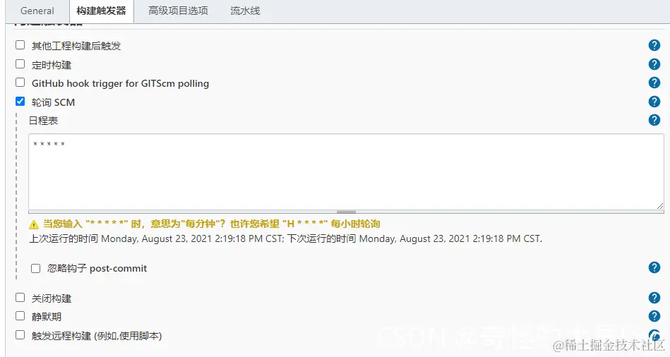 1.轮询SCM,是指定时扫描本地代码仓库的代码是否有变更,如果有代码变更就触发项目构建。