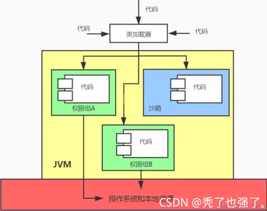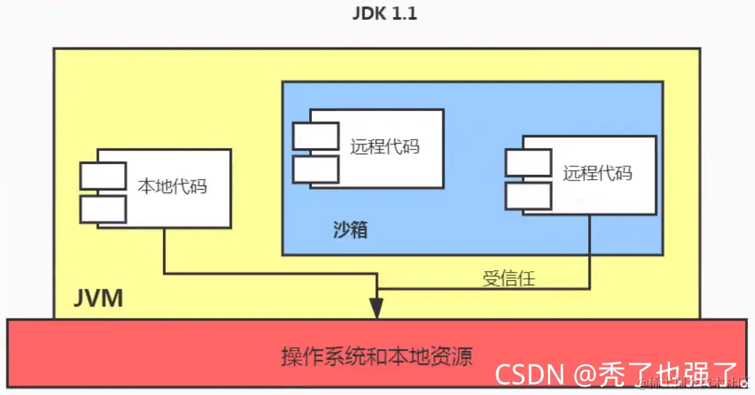 因此在后续的Java1.1版本中,针对安全机制做了改进,增加了安全策略。允许用户指定代码对本地资源的访问权限。如下图所示JDK1.1安全模型。