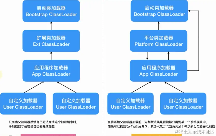 5、类加载的委派关系也发生了变动。