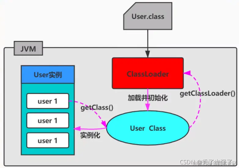 ② 隐式加载则是不直接在代码中调用ClassLoader的方法加载class对象,而是通过虚拟机自动加载到内存中,如在加载某个类的class文件时,该类的class文件中引用了另外一个类的对象,此时额外引用的类将通过JVM自动加载到内存中。(User u = new User(); // 隐式加载User类)