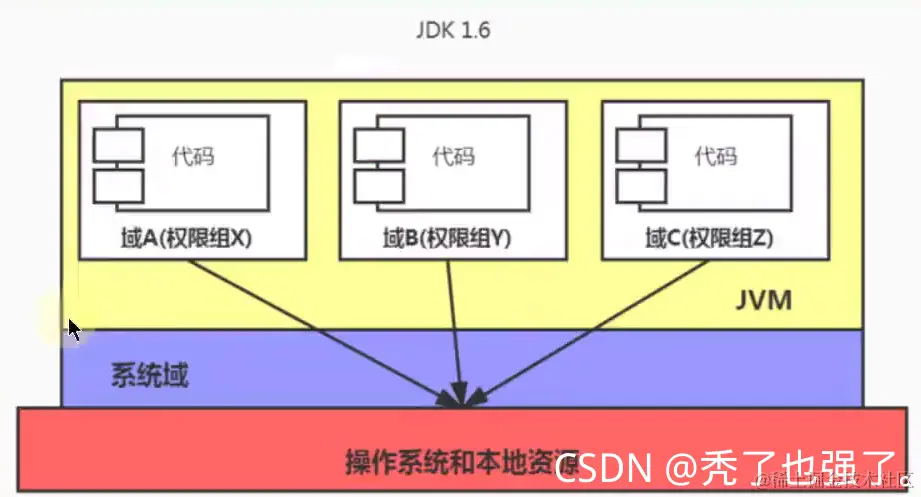 虚拟机会把所有代码加载到不同的系统域和应用域。系统域部分专门负责与关键资源进行交互,而各个应用域部分则通过系统域的部分代理来对各种需要的资源进行访问。虚拟机中不同的受保护域(Protected Domain),对应不一样的权限(Permission)。存在于不同域中的类文件就具有了当前域的全部权限,如下图所示,最新的安全模型(JDK1.6)
