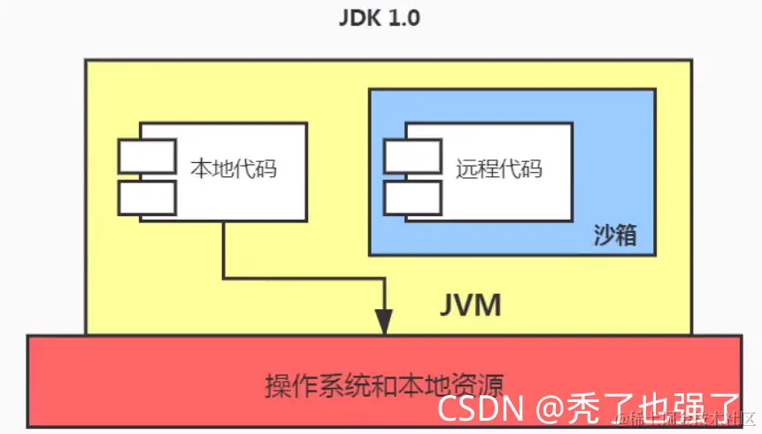 在Java中将执行程序分成本地代码和远程代码两种,本地代码默认视为可信任的,而远程代码则被看作是不受信的。对于受信的本地代码,可以访问一切本地资源。而对于非授信的远程代码在早期的Java实现中,完全依赖于沙箱(Sandbox)机制。如下图所示JDK1.0安全模型。