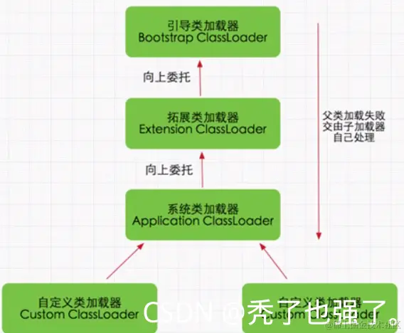 · 除了顶层的启动类加载器外,其余的类加载器都应当由自己的“父类”加载器。