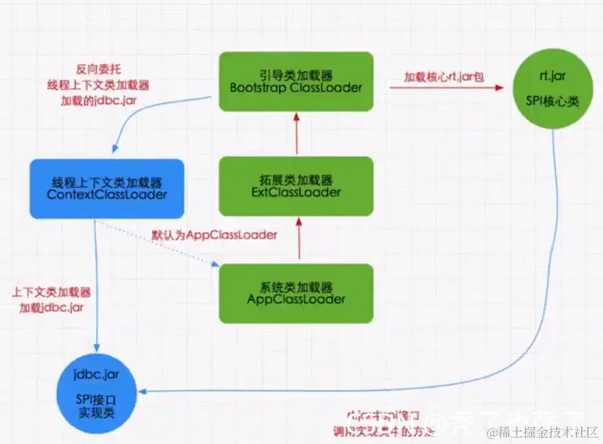 ① 双亲委派模型。但不是所有类加载都遵守这个模型,有的时候,启动类加载器所加载的类型,是可能要加载用户代码的,比如JDK内部的ServiceProvider/ServiceLoader机制,用户可以在标准API框架上,提供自己的实现,JDK也需要提供些默认的参考实现。例如,Java中JNDI、JDBC、文件系统、Cipher等很多方面,都是利用的这种机制,这种情况就不会用双亲委派模型去加载,而是利用所谓的上下文加载器。