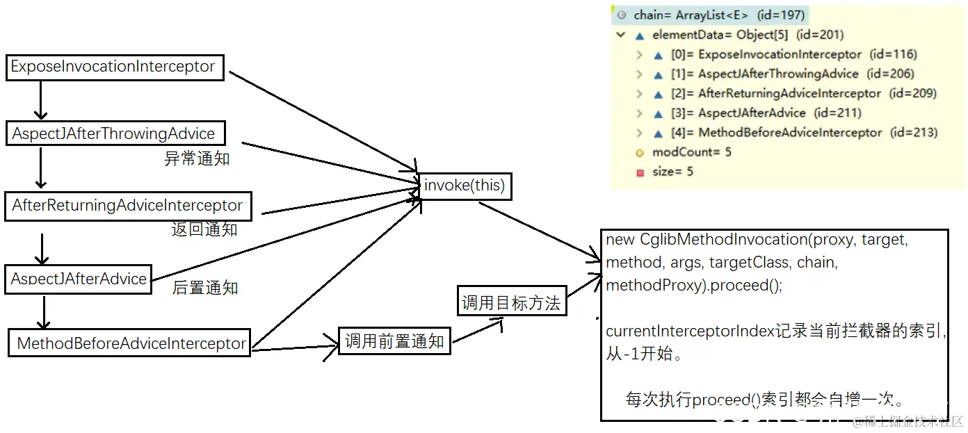 拦截器链的机制,保证通知方法与目标方法的执行顺序。