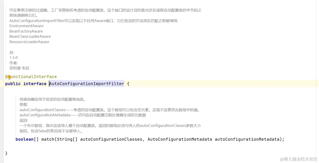 可以在spring.factories设置一个key:org.springframework.boot.autoconfigure.AutoConfigurationImportFilter,value为AutoConfigurationImportFilter的实现类,可以使用BeanClassLoaderAware、BeanFactoryAware、EnvironmentAware、ResourceLoaderAware。