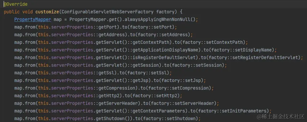 - 然后调用ServletWebServerFactoryCustomizer对象的customize方法,把TomcatServletWebServerFactory对象传入进去