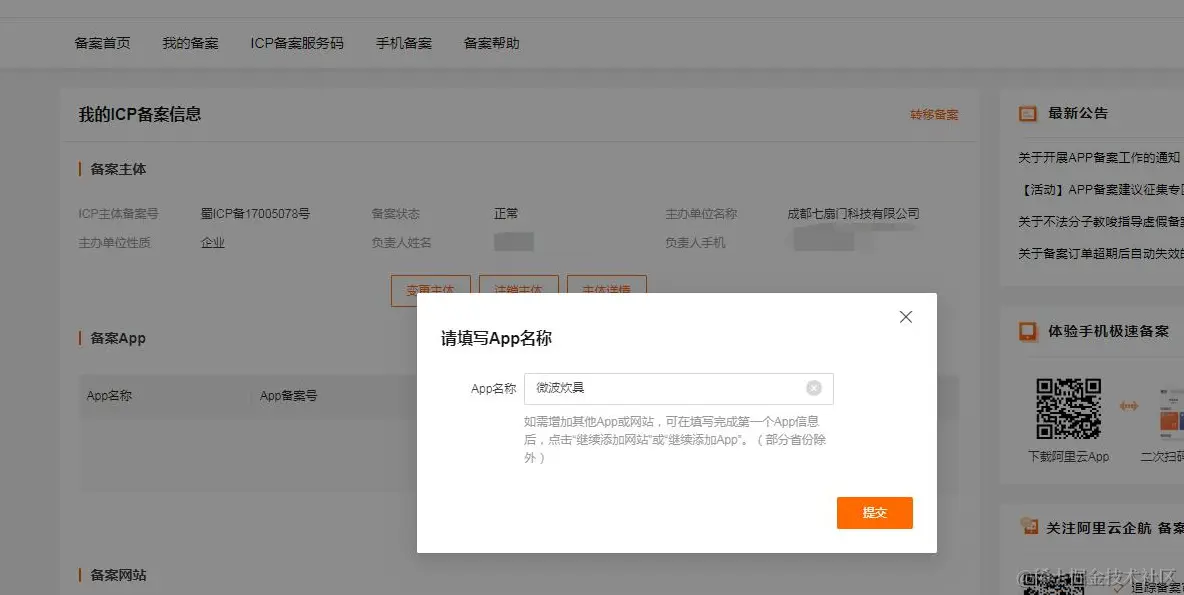 之后进入我的备案,新增APP;如果是第一次备案,根据阿里云官网教程操作即可在备案列表里面,域名备案信息里面,点击新增APP按钮