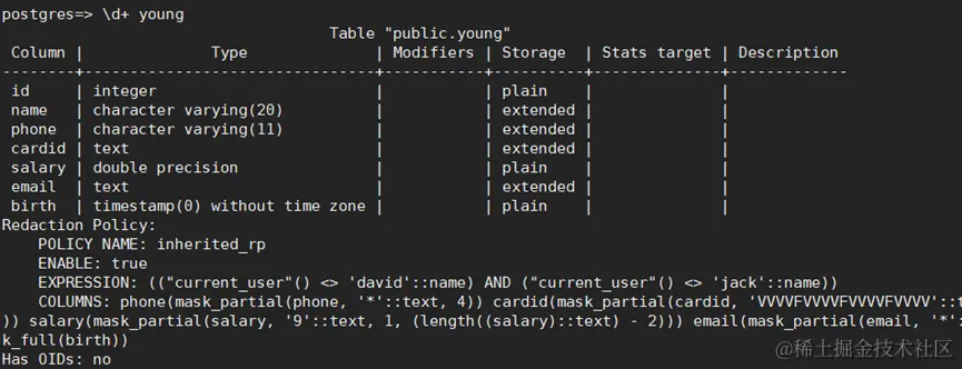 执行语句后,员工Alice查看目标表样时发现查询young表的脱敏行为与我们的原表emp行为一致(图一)。当我们查看Alice表定义时(图二),发现Alice并没有手工创建脱敏策略,而是关联了脱敏策略inherited_rp,INSERT执行过程触发脱敏策略的继承,从而保证我们的数据库内可算,又保证了数据的隐私性。