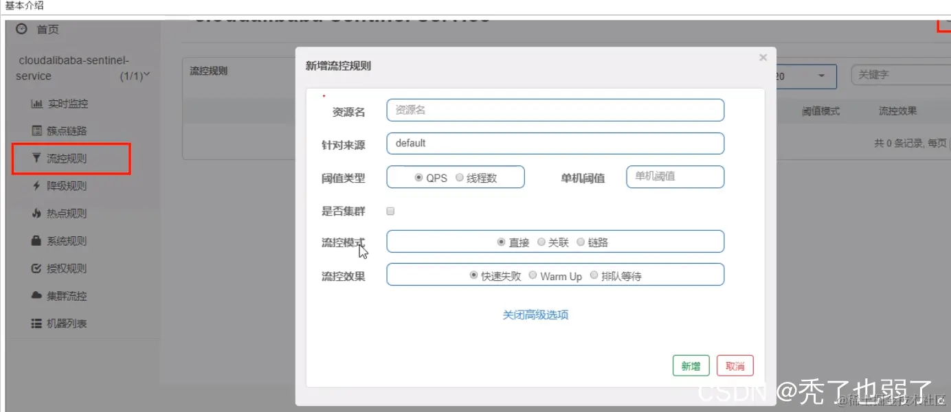 2.针对来源:Sentinel可以针对调用者进行限流,填写微服务名,默认default(不区分来源)。
