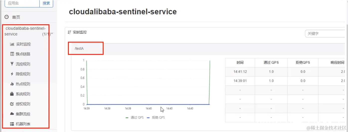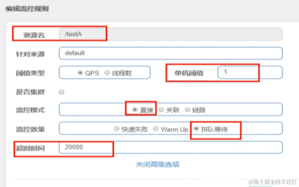 设置含义:/testA每秒1次请求,超过的话就排队等待,等待的超时时间为20000毫秒。