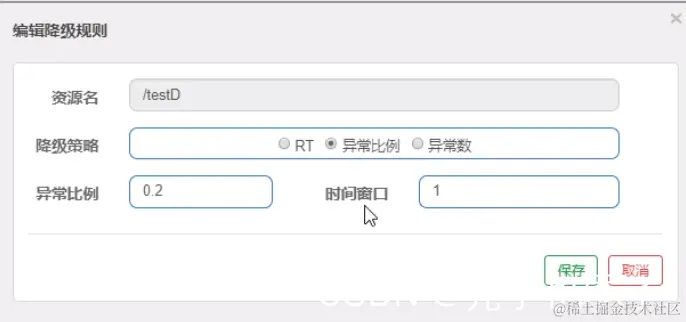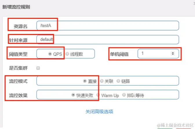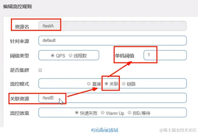 以下配置表示:当关联资源/testB的qps阈值超过1时,就限流/testA的Rest访问地址,当关联资源到阈值后限制配置好的资源名。