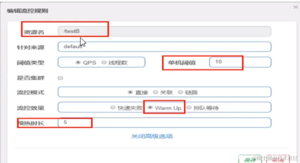 Warm Up(预热):根据codeFactor(冷加载因子,默认3)的值,从阈值/codeFactor,经过预热时长,才达到设置的QPS阈值。