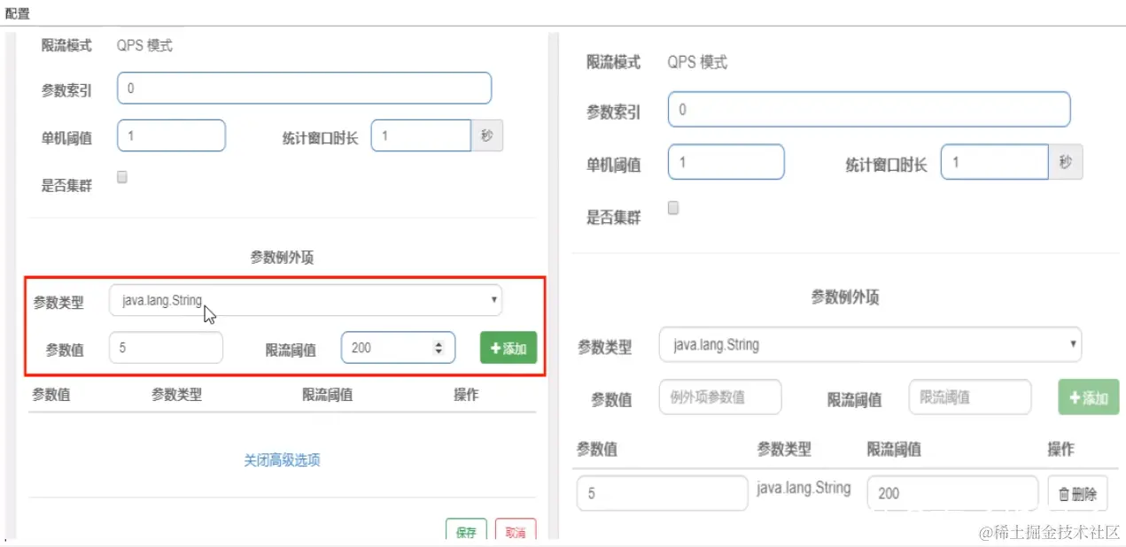 2.特例:我们希望p1参数当它是某个特殊值时,它的限流值和平时不一样(加入当p1的值等于5时,它的阈值可以达到200)。