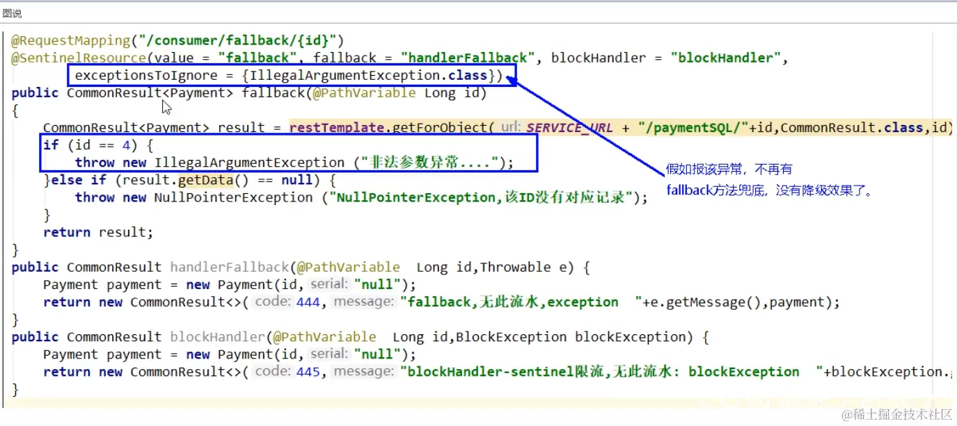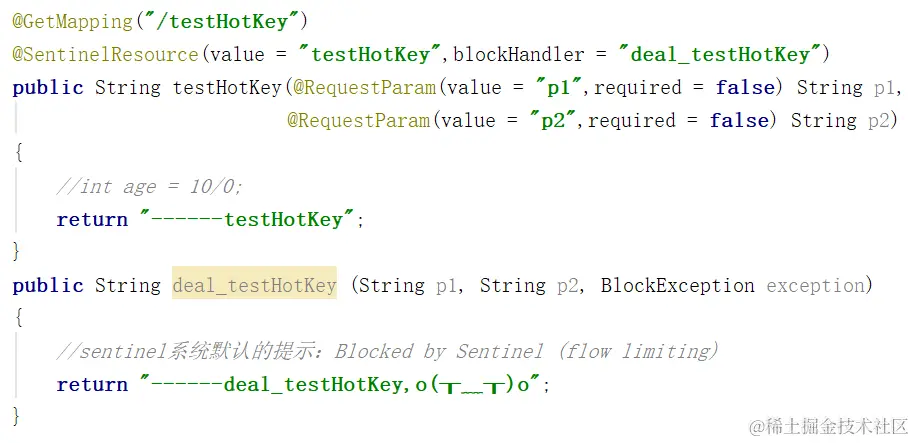 @SentinelResource(value = "fallback",fallback = "handlerFallback",blockHandler = "blockHandler",