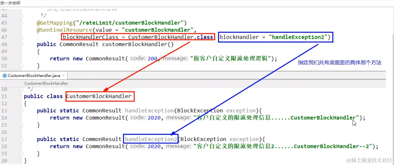//若blockHandler和fallback都进行了配置,则被限流降级而抛出BlockException时只会进入blockHandler处理逻辑。