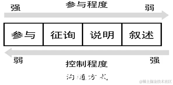一般的沟通过程所采用的方式分为以下几类:参与讨论方式、征询方式、推销方式(说明)、叙述方式,如图所示: