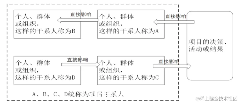 项目干系人是能影响项目决策、活动或结果的个人、群体或组织,以及会受或自认为会受项目决策、活动或结果影响的个人、群体或组织,客户、发起人、执行组织和有关公众等都是典型的干系人。