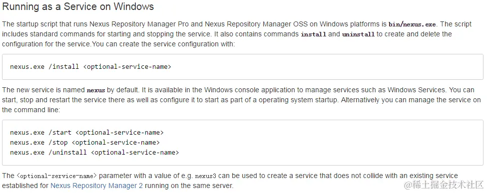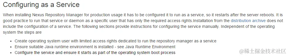 根据官方文档说明,将nexus配置为系统服务是一个很好的选择。因为