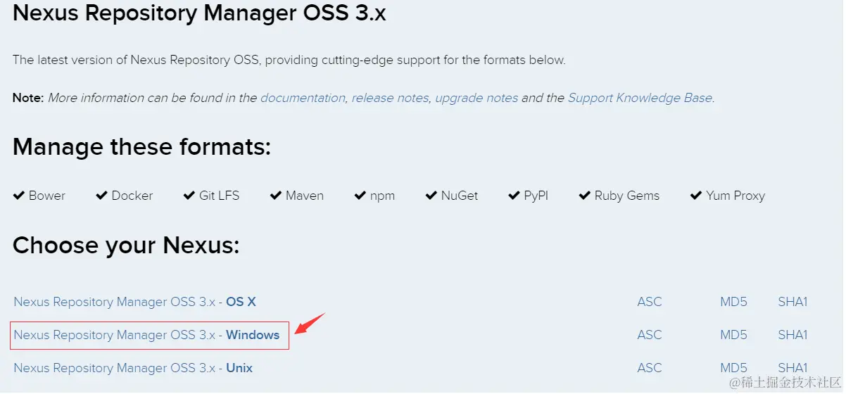 这里我们下载开源版 Nexus OSS。Nexus 提供两种安装包,一种是包含 Jetty 容器的 bundle 包,另一种是不包含容器的 war 包。下载地址:Nexus Repository OSS - Software Component Management | Sonatype。