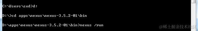 然后cmd,命令窗口进入nexus-3.5.2-01目录下的bin目录下,按照官方的启动方式,需要在bin目录下使用nexus /run命令启动,如下图