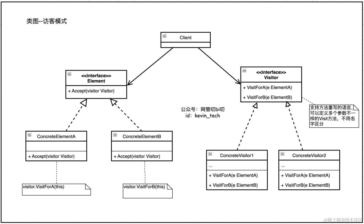 - 访客接口 (Visitor) 声明了一系列以表示对象结构的具体元素为参数的访问者方法。 如果编程语言支持重载, 这些方法的名称可以是相同的, 但是其参数一定是不同的。