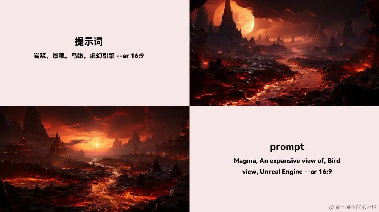 这里用到了--no glare(不要炫光/强光)是因为MJ在生图的时候,地平线位置出现了大片金黄色的强光,此时直接使用--no 参数设置来避免错误的图像。随即便得到了满意的图像。