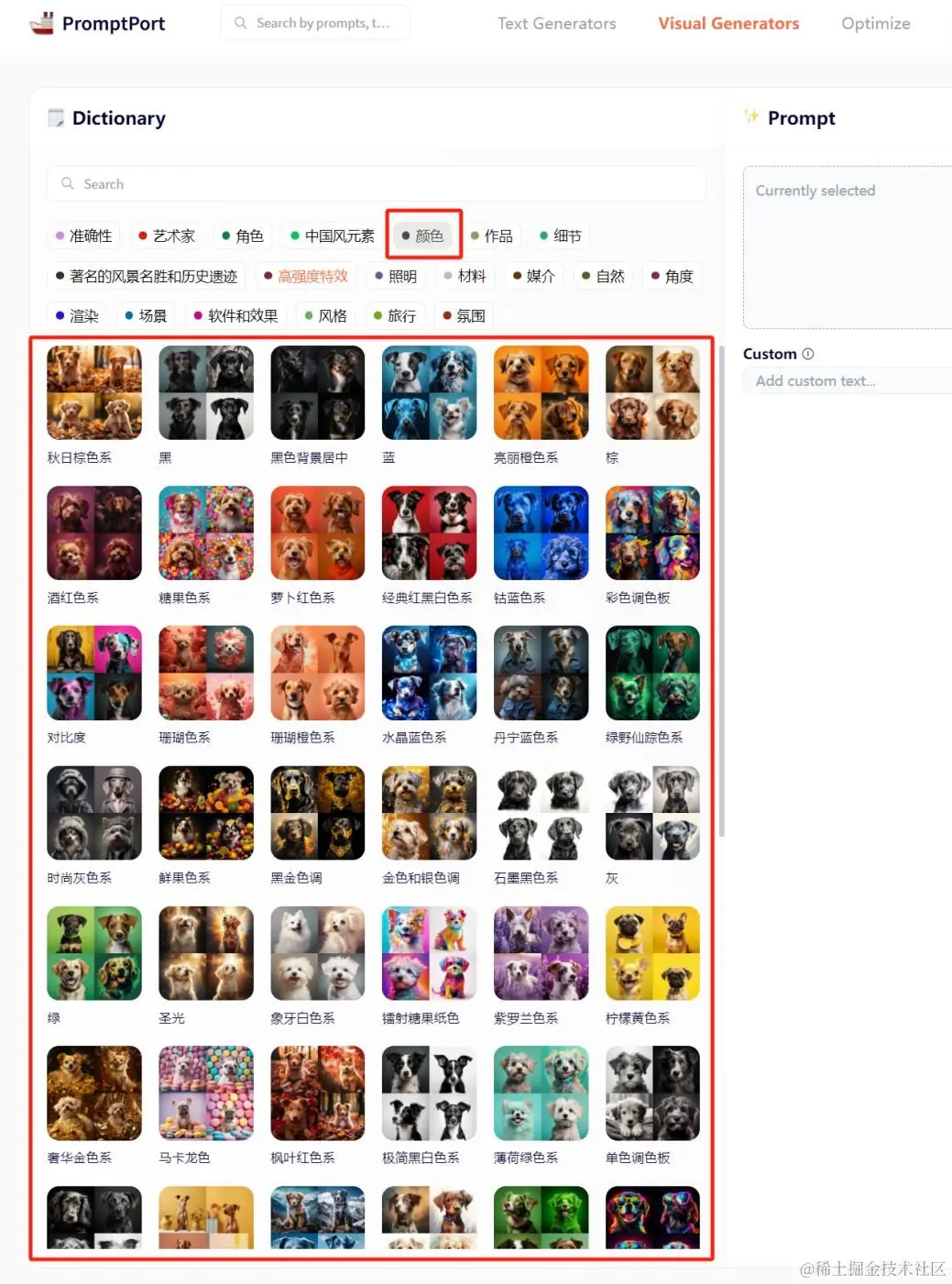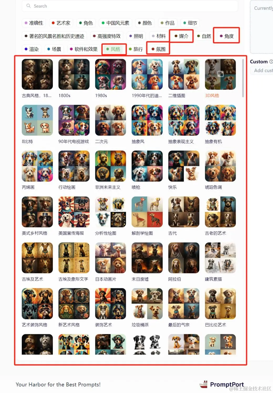 而在promptport中,收录了600多左右的媒介、风格、视角和氛围的选项,包括著名的艺术家的绘画风格、古代艺术、近现代艺术和现代艺术。供你diy你的图像,你可以在其中挑选最符合你预期的选项。