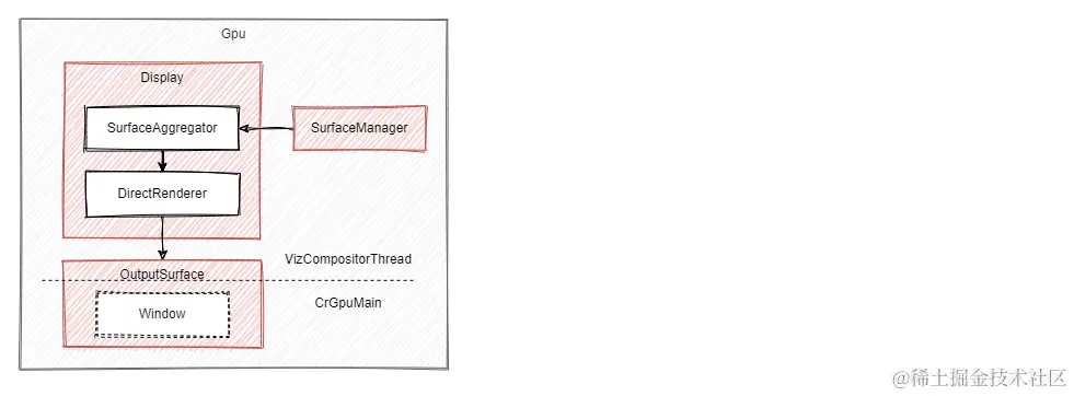 虚线之上运行在 Compositor 线程,虚线之下运行在 GPU 线程,OutputSurface 需要对接 DirectRenderer 和最下层的渲染,所以不同部分运行在不同的线程中。