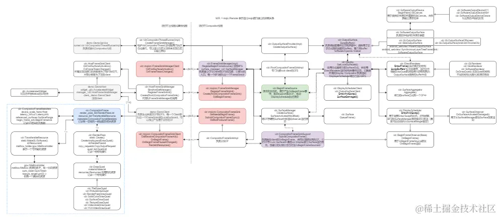 viz::mojom::CompositorFrameSinkClient作为 client,表示一个画面的来源;viz::CompositorFrameSink(Impl/Support)用于处理 CF 的地方,一个 client 可以有多个 CompositorFrameSink;viz::RootCompositorFrameSinkImpl作用和 CompositorFrameSink 类似,只不过专门处理 root client,每个 client 有且只有一个该对象。它还负责为对应的 client 初始化渲染环境,包括 OutputSurface, Display 的创建。viz::FrameSinkManagerImpl用于管理 CompositorFrameSink, 包括其创建和销毁;viz::SurfaceAggregator负责 Surface/CF 的合成,比如dirty区域的计算等,不负责绘制;viz::OutputSurface封装渲染目标,和各平台的渲染目标直接对接;viz::DirectRenderer封装绘制 DrawQuad 的方式,负责将 DrawQuad 绘制到 OutputSurface 上;viz::Display一个中控类,将 SurfaceAggregator/DirectRenderer 以及 Overlay 的功能串起来形成流水线;viz::DisplayScheduler调度viz::Display何时应该采取行动;