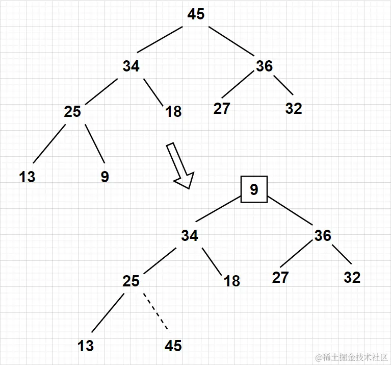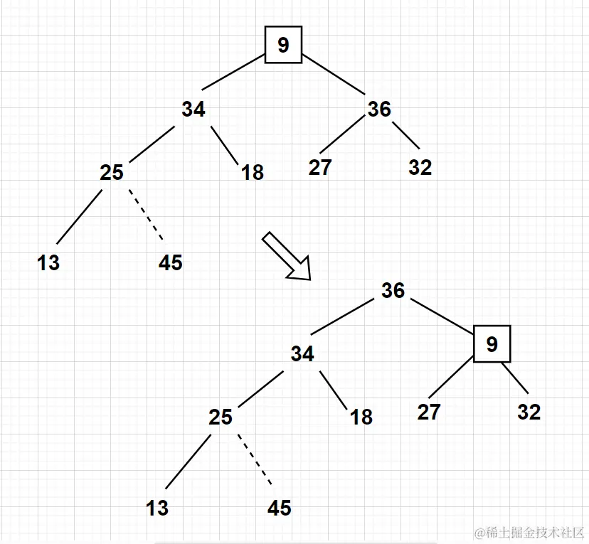 s不等于i,那么交换s与i的值,因为原本的元素位置下移了,将i赋值为s,然后继续循环。在下图这个例子中,插入堆顶的元素9和左右子节点分别比较,最后把最大的36交换到了堆顶。