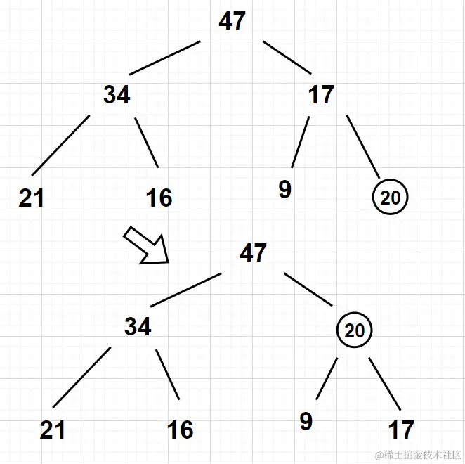 exchange方法)。下图中,被插入的新元素20大于其父节点元素17,于是将17向下调整,让20"上浮"。 -