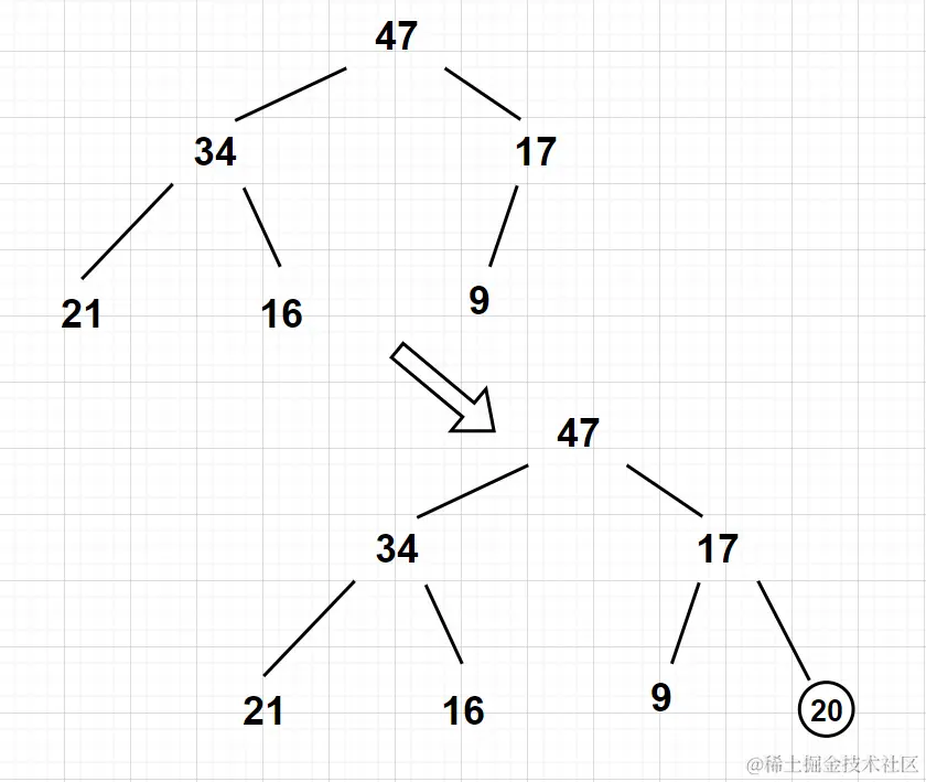 一种广为流传的做法是,首先将需要插入的新元素放到数组末尾 - 相当于在二叉树的最后一层找个最左边的空闲位置将它设为叶节点,如果最下一层已经充满,则另起一层。下图中是将新元素20插入到右侧子节点: