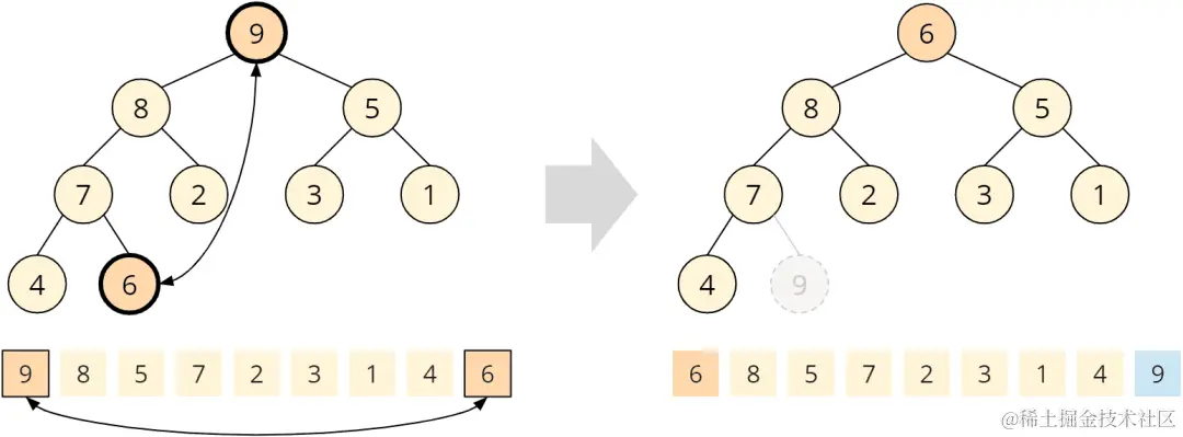另一项重要操作是弹出堆顶元素,同样,我们采取先更改再重新平衡的策略,先把数组的第一个和最后一个元素交换一下,然后对count减一。下图中,原本的堆顶元素是45,堆末端元素则是9,现在交换位置并通过递减count把45先删除掉