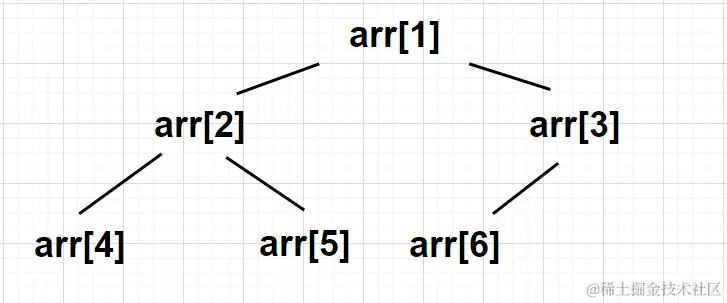 二叉堆的逻辑结构是一种近乎全充满的二叉树(通用的名词是"完全二叉树") - 假设有一个n层的二叉堆,其前n-1层都是满的,第n层的节点则倾向于先布满左侧。下图是一个具有6个元素的二叉堆arr,它可以用一个长度为6的数组存放,图上已经标出了各节点在对应数组中的位置