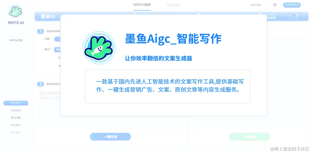 - 墨鱼AIGC: 是一款AI文案写作工具,为用户提供基础写作,一键生成营销广告、文案、原创文章等智能写作服务。