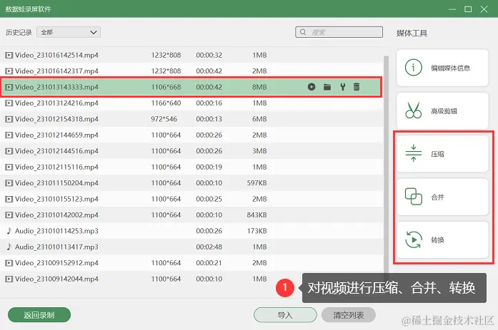 步骤4:如果您想分享到不同的媒体平台,可以在录制历史页面,对视频进行压缩、合并和转换,方便进行分享。