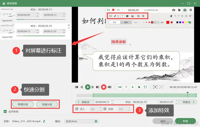 步骤3:录制过程中,可以使用工具箱来对微课内容进行注释、添加文字等操作。录制结束后,软件拥有 “高级剪辑” 功能,方便您进行视频剪辑。