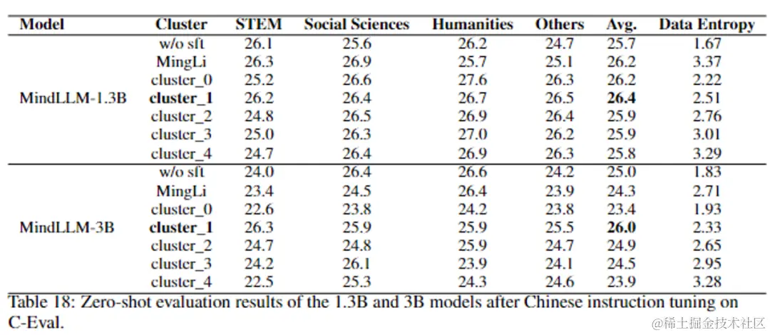 如何定义高质量的指令微调数据?有学者提出指令微调数据的多样性可以代表指令微调数据集的数据质量。然而根据我们的实验发现,指令微调的数据熵和数据长度会更加影响轻量级模型的性能。我们将每条数据在预训练模型上的交叉熵损失定义为该数据的数据熵,并通过K-Means算法依据数据熵对数据进行聚类得到不同的数据簇。MindLLM经过每个数据簇的指令微调后再C-Eval的结果如下表所示(MMLU的结果详见论文Table19):