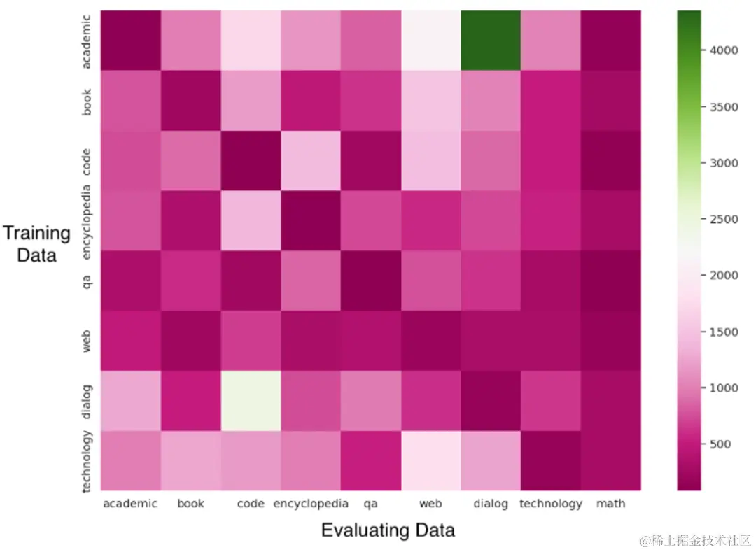 不同数据集展现出不同程度的泛化能力,例如:网页文本、百科全书和问答数据训练的模型在多个数据源上展现出较强的泛化能力,表明它们的内容包含了各个领域的多样信息。相比之下,学术论文数据和代码数据训练的模型在数学能力上表现出色,但在泛化方面较弱,可能是由于领域特定性和独特的格式信息。