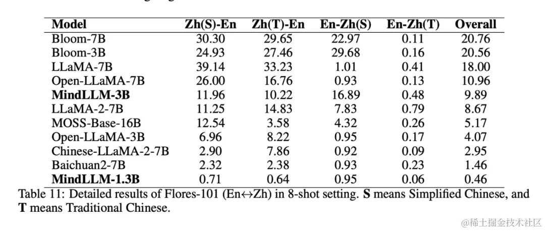 此外,我们发现数据量更少,但是使用了中英文数据训练的MindLLM-1.3B在MMLU上的表现优于GPT-Neo-1.3B,我们推测这可能是双语学习带来的增益,因为不同语种在能力之间也存在共通性。详细实验和分析可查看论文4.4节。