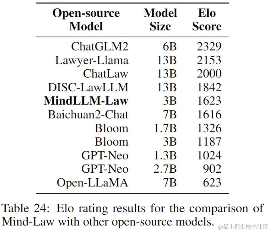 为了避免人类评估产生的偏差和专业知识不足造成的错误,我们使用采用chatgpt作为评估器,具体方法如下。由ChatGPT生成的多轮法律咨询对话数据集,提取了其中100个对话作为我们的评估数据。我们使用ChatGPT来评估模型对于法律咨询的回复,让ChatGPT对于模型的回复进行排序,再根据排序结果计算Elo分数。最终筛选出一个最佳模型作为 MindLLM-Law 和其它开源模型相比较。