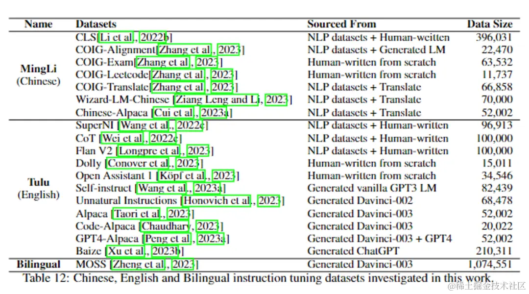 我们想要探讨在轻量级模型上,不同类别数据集的指令微调会有什么样的性能表现。下表是我们使用的指令微调数据集,包含我们重新构造的中文数据集MingLi、公开数据集Tulu(英文)和中英双语数据集MOSS。