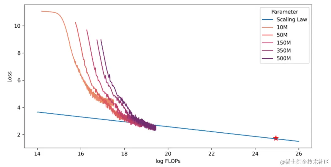 为了确保在深度学习和大型语言模型的训练成本不断增加的情况下获得最佳性能,我们进行了数据量和模型容量之间的关系研究,即Scaling Law。在着手训练具有数十亿参数的大型语言模型之前,我们首先训练较小的模型,以建立训练更大模型的扩展规律。我们的模型大小范围从1千万到5亿参数不等,每个模型都在包含高达100亿tokens的数据集上进行了训练。这些训练采用了一致的超参数设置,以及前文提到的相同数据集。通过分析各种模型的最终损失,我们能够建立从训练FLOP(浮点运算数)到Loss之间的映射。如下图所示,不同大小的模型饱和的训练数据量不同,随着模型大小的增加,所需的训练数据也增加。为了满足目标模型的精确数据需求,我们使用了幂律公式来拟合模型的扩展规律,并预测出3B参数模型的训练数据量与Loss数值,并与实际结果进行对照(图中星标)。