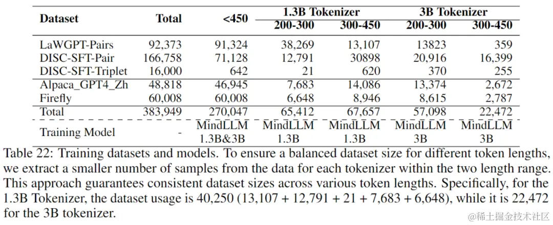 我们收集了一些公开的法律相关数据,并结合了一些通用指令数据对 MindLLM 进行指令微调 (SFT)。为了探究数据的 token 长度是如何影响模型在具体领域上的性能的,我们使用不同数据长度的数据来分别训练 MindLLM。我们首先筛选了长度小于450的全部数据,然后分别使用 MindLLM-1.3B 和 MindLLM-3B 的Tokenizer筛选出长度在200-300和300-450之间的数据。数据统计和所对应的训练模型如下表所示: