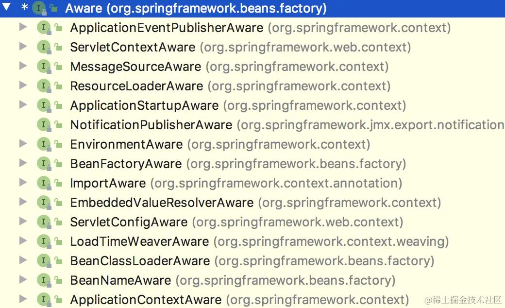 Spring Aware 接口包括了多个子接口,每个子接口对应于不同的 Spring 容器资源或功能。