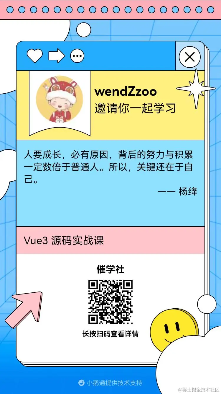 斥巨资购入大崔哥的 mini-vue 课程,为了改变自己东一榔头西一棒槌的学习状态,也是因为深刻思考了自己身无长物浑浑噩噩这么多年只会敲代码,别无出路,也只能提升自己继续走技术这条路,那提高技术绕不过去的就是读源码。