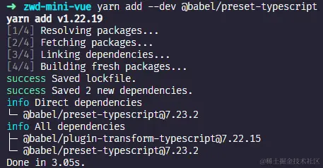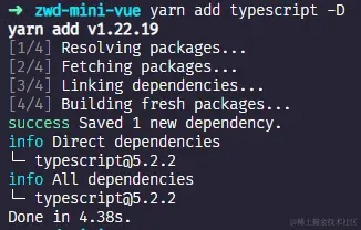 整个项目都是ts实现的,按照上文介绍创建的文件,此时应该都是飘红的,因为还没有安装 ts 依赖呀。终端中根目录下执行yarn add typescript -D,安装typescript