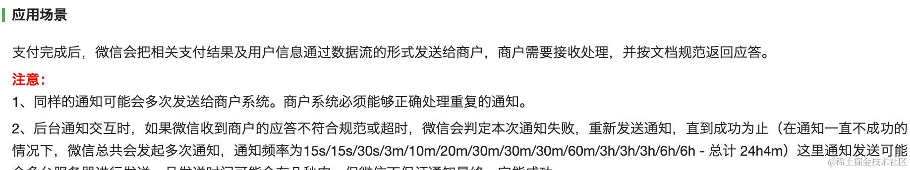 工作中经常要和第三方做对接,比如支付、电子合同等系统。操作成功之后,第三方会发送异步的通知,返回最终的处理结果,使用异步而不是使用同步通知,是为了加快系统响应速度,防止线程阻塞。任务处理完成后通过异步的通知,发送给对应的服务端。之前对接微信支付,完成支付后,微信发送一个异步通知给服务端,服务端根据支付通知修改状态,通知规则看到以下的一段话。